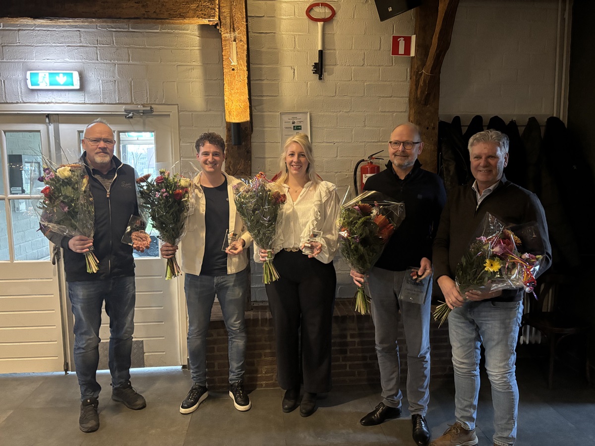 Op de foto de aanwezige jubilarissen: v.l.n.r. Roy Postma, Milan Nijhuis, Lauren Damhuis, Patrick Welman en René Schuilenburg.